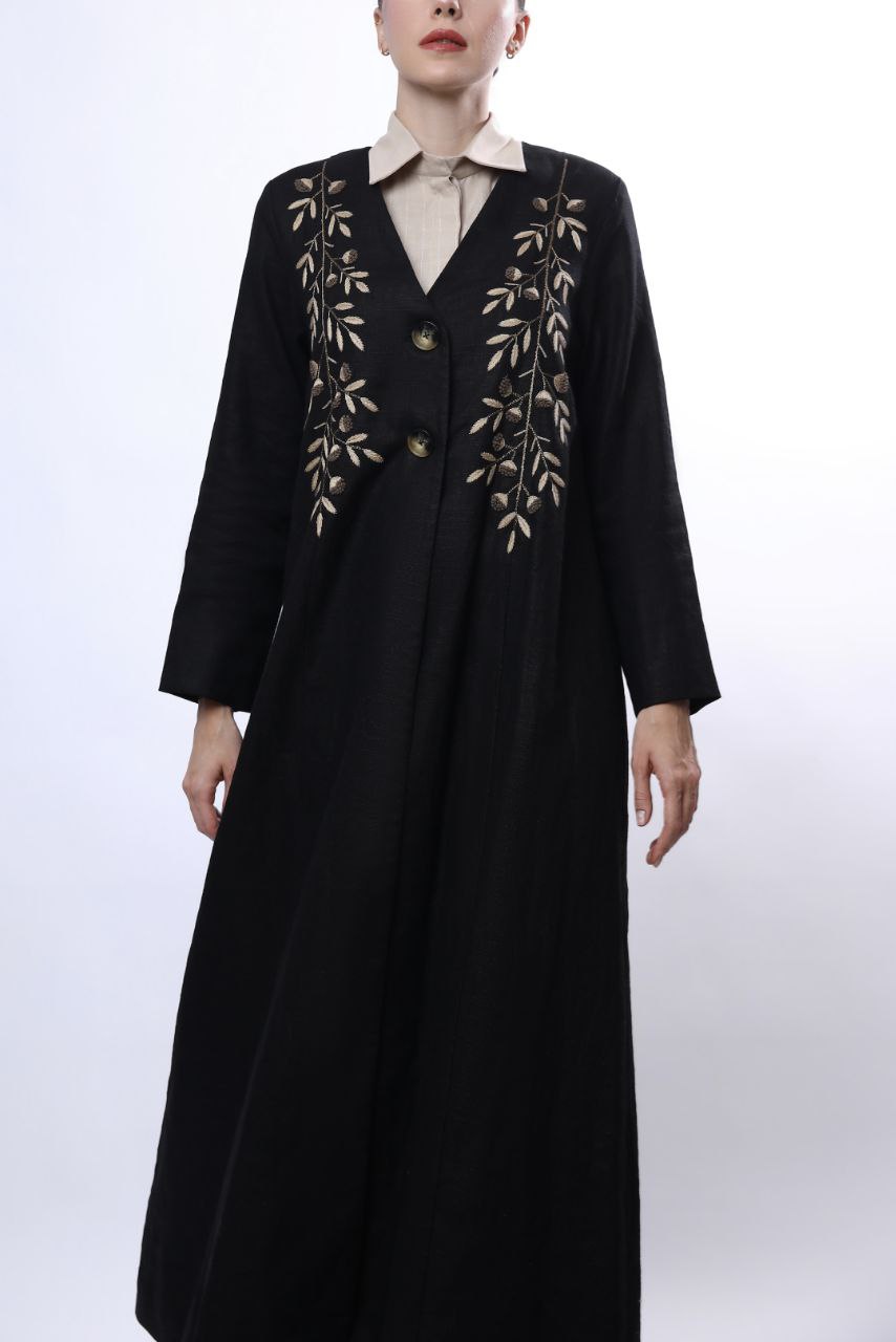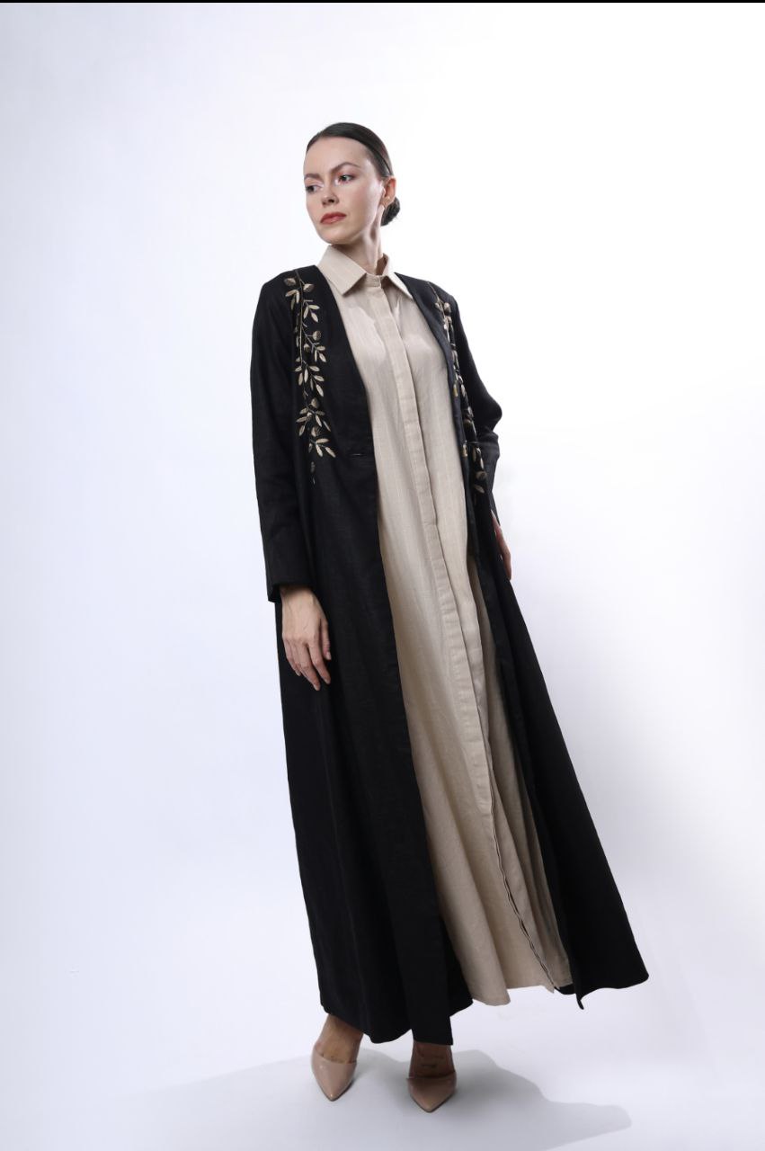 Golden leaf collar abaya Fabric silk taffeta from Saif Abaya the Saudi fashion brand and is one of the best Saudi brands