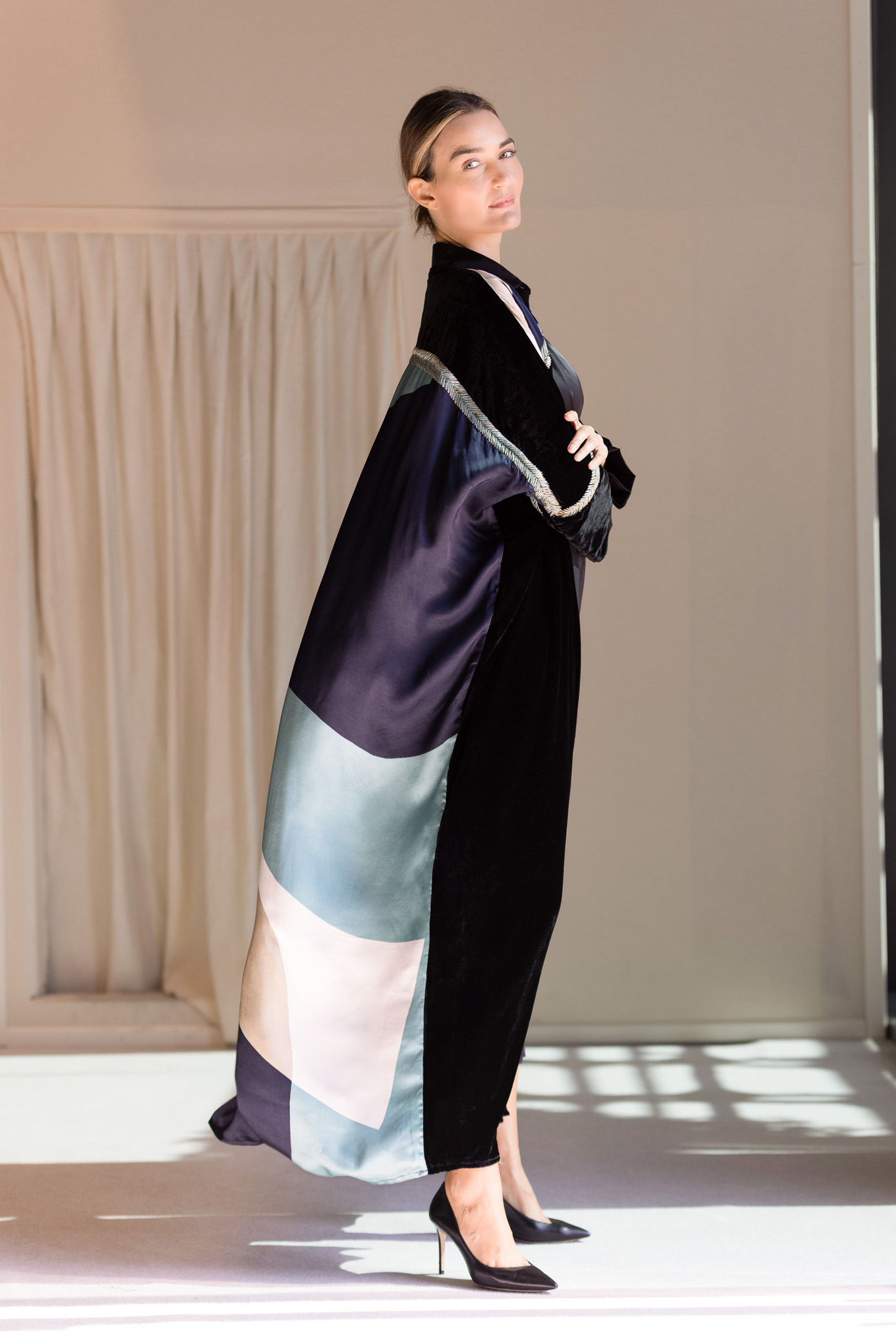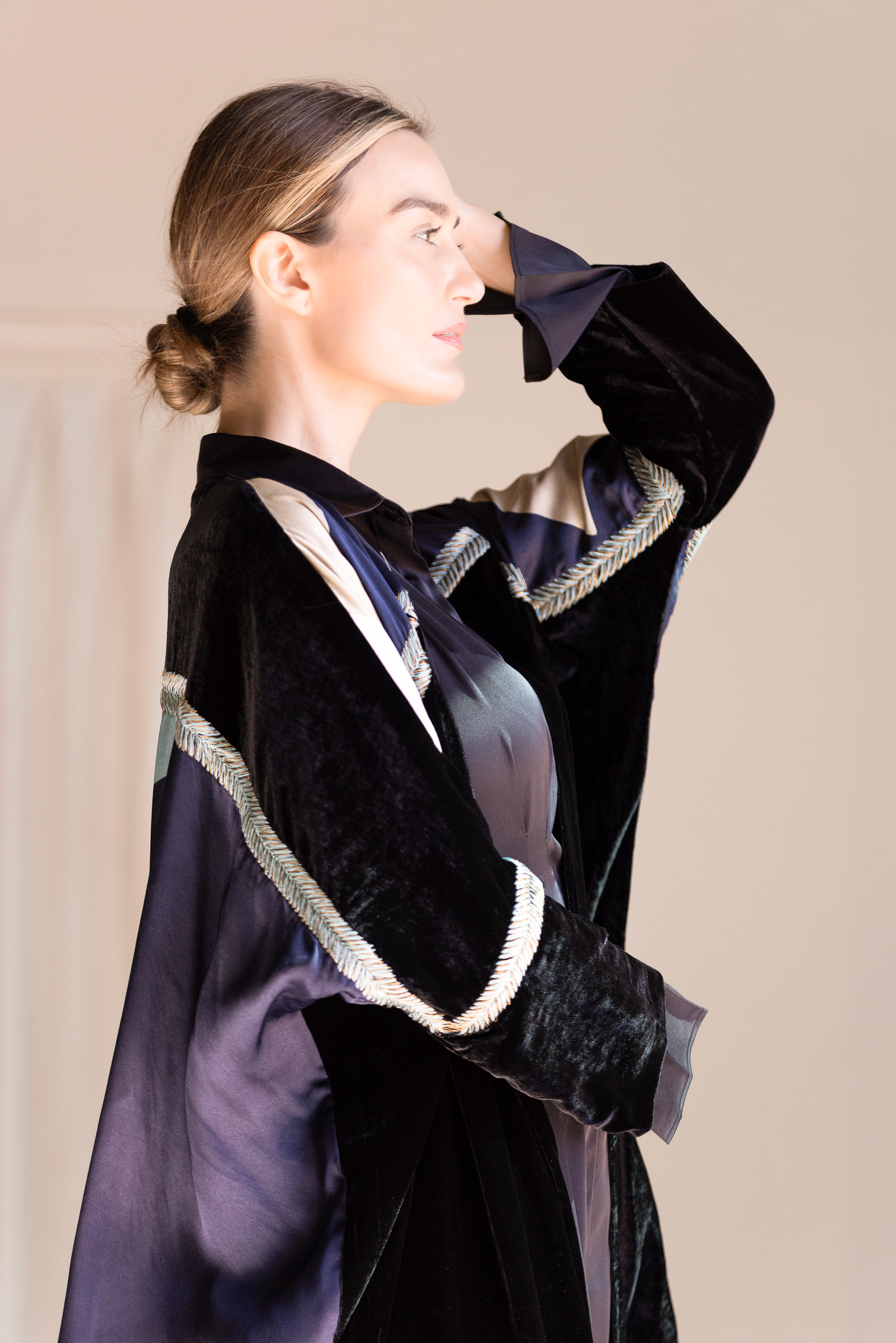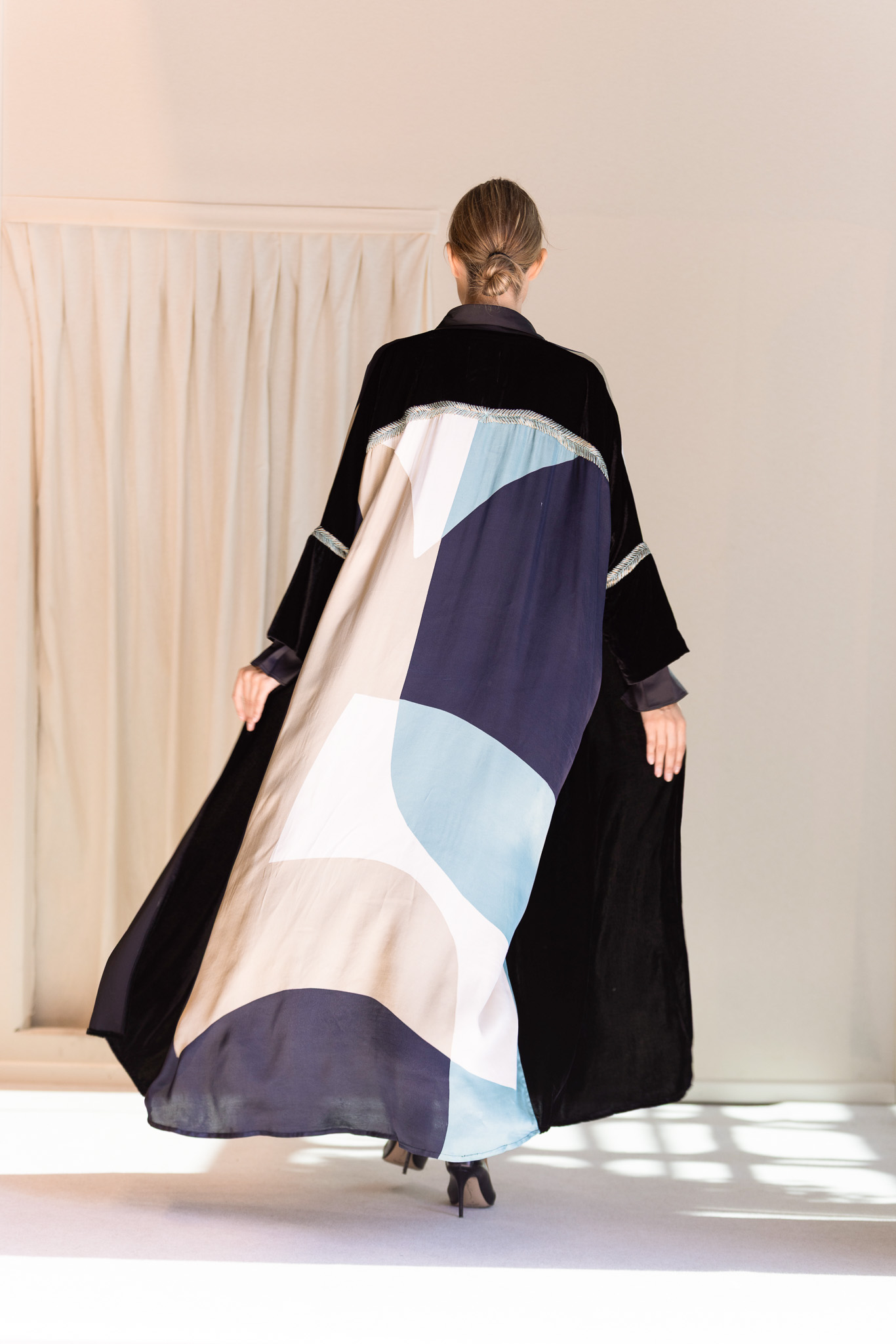 Crafted with a velvet upper, a printed silk lower panel, and hand embroidery in three threads, including fine zari accents.